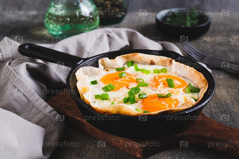 Домашнее смешанное яйцо в пита-хлебе с травами на сковородке на столе