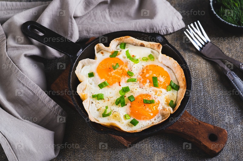 Жареные яйца с зеленым луком в тортильях на сковороде на столе