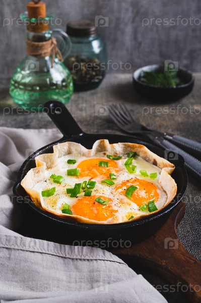Домашнее смешанное яйцо в пита-хлебе с травами на сковороде на столе вертикальный вид
