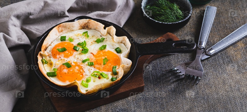 Домашнее смешанное яйцо в пита-хлебе с травами на сковороде на столе WEB баннер