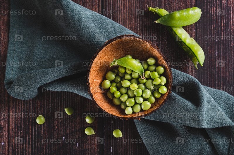 Закройте свежий зеленый горох в миске и в луковицах на вид с вершины стола