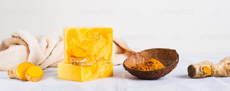 Естественное домашнее омолаживающее мыло с куркумой на столе веб-баннер