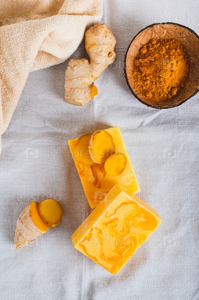 Органическое увлажняющее мыло из куркумы на верхней части стола и вертикальный вид