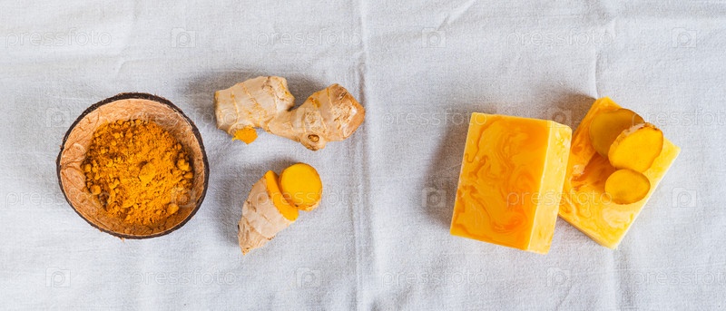 Органическое мыло с увлажняющим кремом из куркумы на столе top view web banner