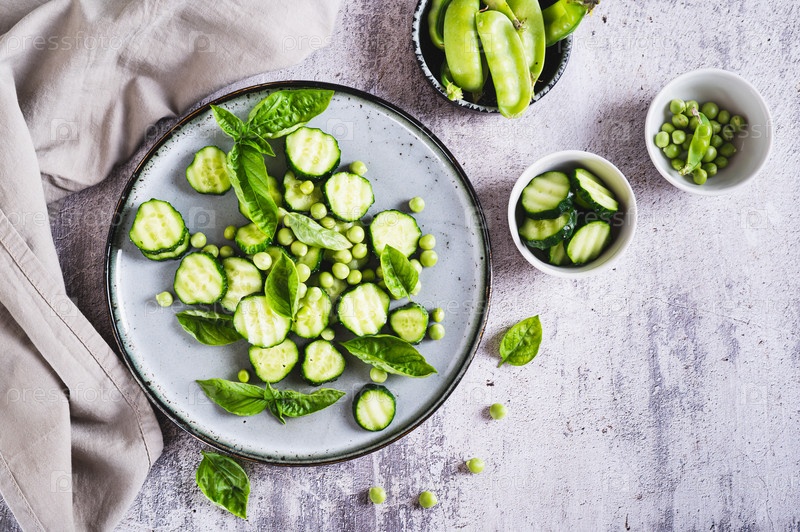 Антиоксидантный салат из свежих огурцов, зеленого гороха и базилика на тарелке на столе сверху