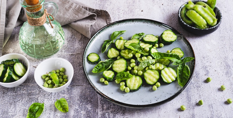 Антиоксидантный салат из свежих огурцов, зеленого гороха и базилика на тарелке на веб-баннерном столе
