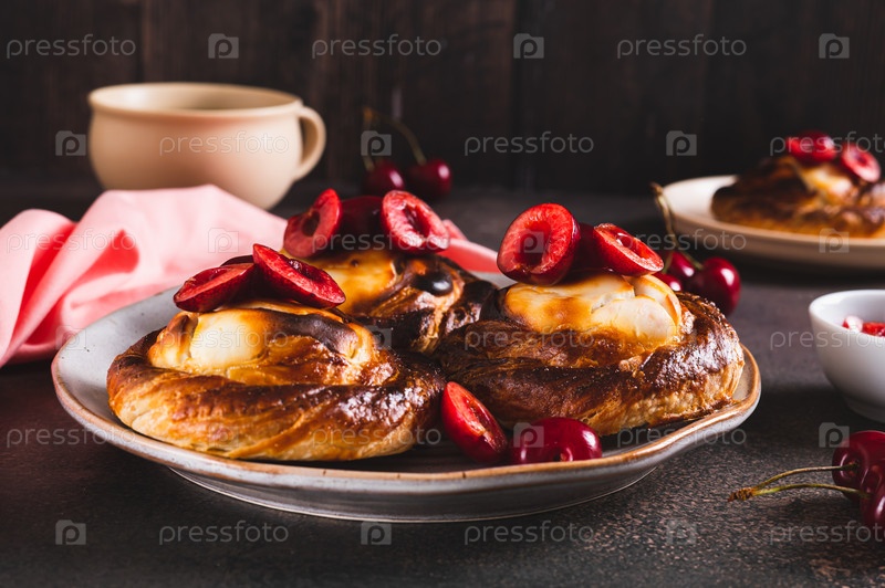 Роскошные булочки с творогом и вишенками на тарелке за столом