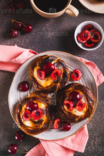Домашние вишневые cheesecakes на тарелке на столе и вертикальный вид