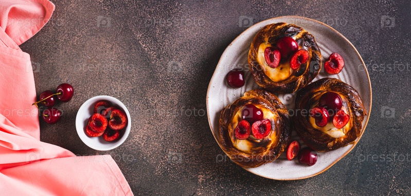Домашние вишневые cheesecakes на тарелке на столе with web banner view