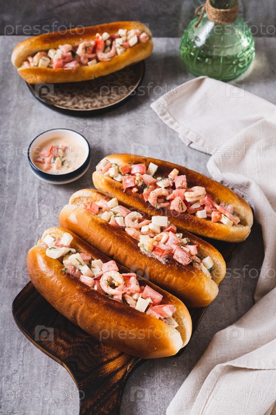 Горячие хот-доги с креветками, томатами, яйцами и соусом на доске на столе с вертикальным видом