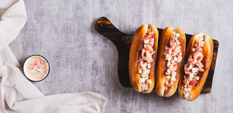 Горячие хот-доги с креветками, томатами, яйцами и соусом на веб-баннере с лучшими просмотрами