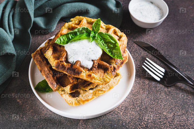 Вафли из цуккини с пряностями, сметаной и травами на тарелке на столе