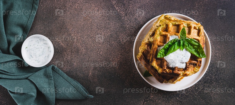 Вафли из цуккини со специями, сметаной и травами на веб-баннере с видом на тарелку