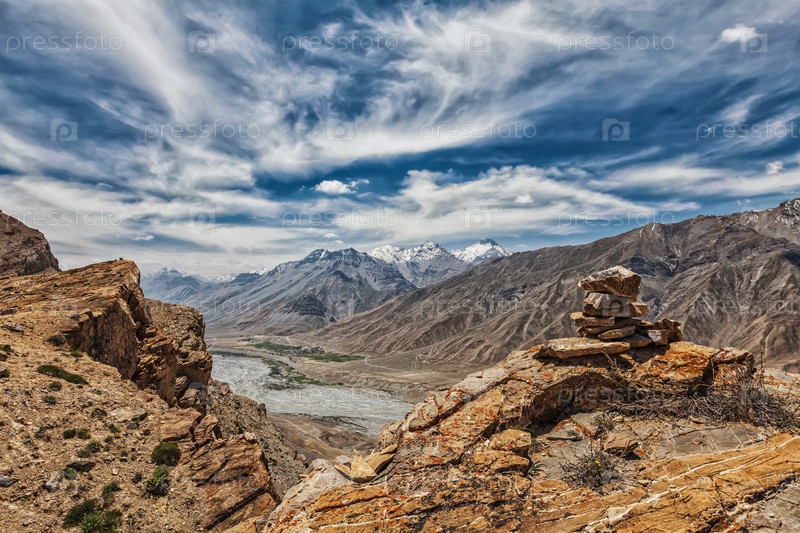 Вид на долину Спити в Гималаях с каменным погребом на скале.Долина Спити, Химачал-Прадеш, Индия