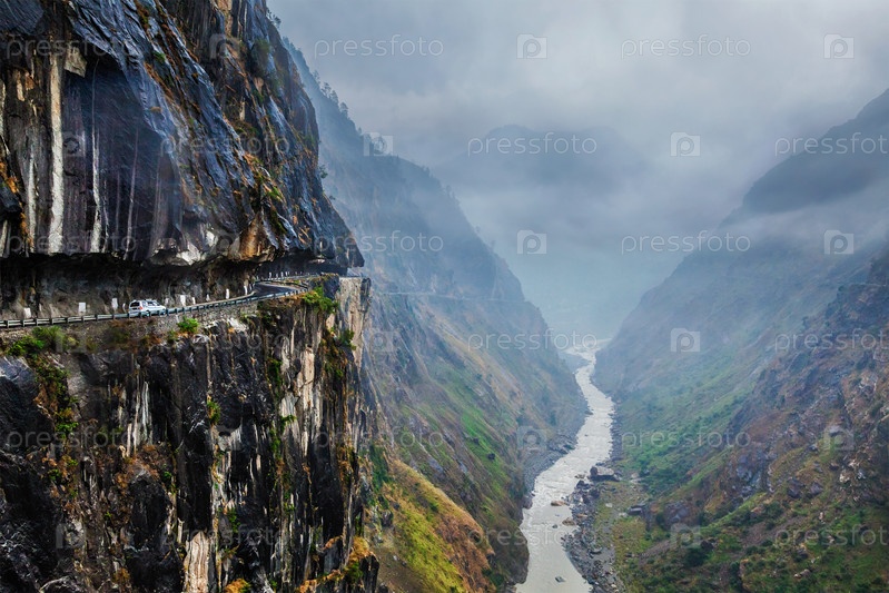 Автомобиль на опасной дороге в горах Гималаев в ущелье над пропастью