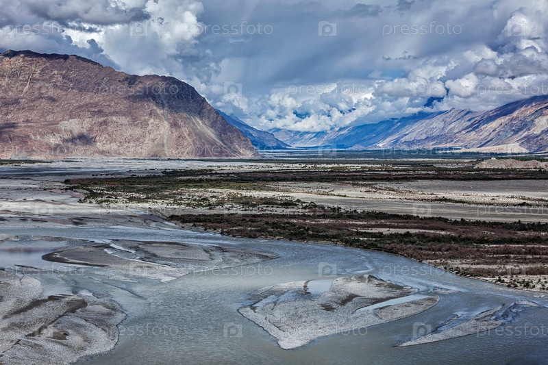 Долина Нубра и река Нубра в Гималаях Ладакх, Джамму и Кашмир, Индия
