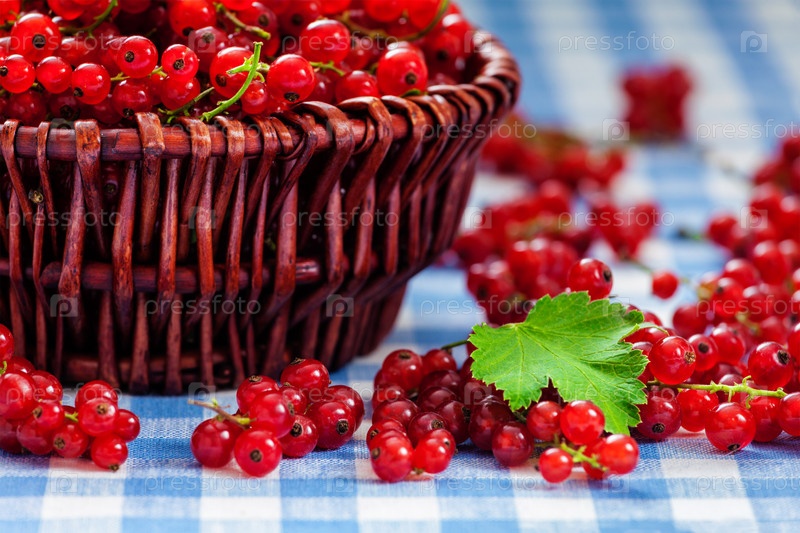 Красные смородины в плетеновой таре на столе
