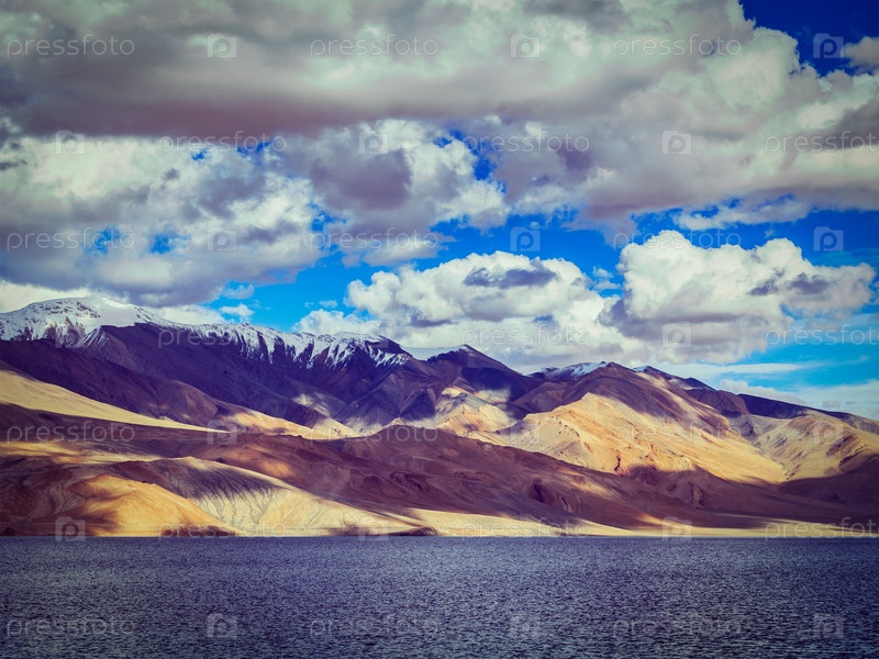Винтажный ретро-эффект отфильтровал изображение хипстерского стиля гималайского горного озера в Гималаях Tso Moriri на закате, Корзок, Ладакх, Индия
