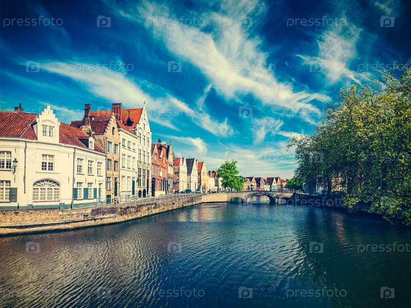 Винтажный ретро-эффект фильтруется в хипстерском стиле изображение канала, моста и ряда старых домов, Брюгге (Brugge), Бельгия