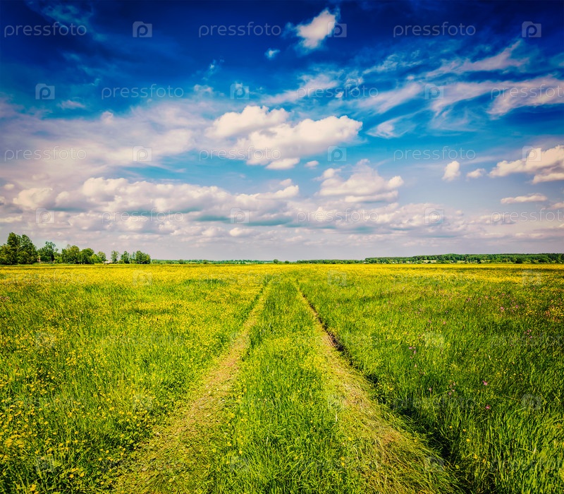 Весеннее лето - сельская дорога в зеленом полевом ландшафте