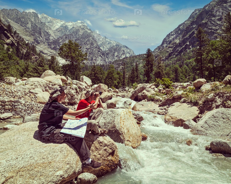 Винтажный ретро-эффект отфильтровал изображение туристического трекера в хипстерском стиле, прочитав карту похода на трассе в Гималаях