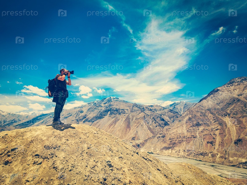 Винтажный ретро-эффект отфильтровал изображение фотографа в стиле хипстера, фотографирующего в Гималаях. долина Спити, Химачал Прадеш, Индия