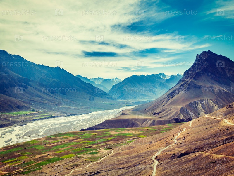 Винтажный ретро-эффект отфильтровал образ хипстерского стиля долины Спити и реки Спити в Гималаях