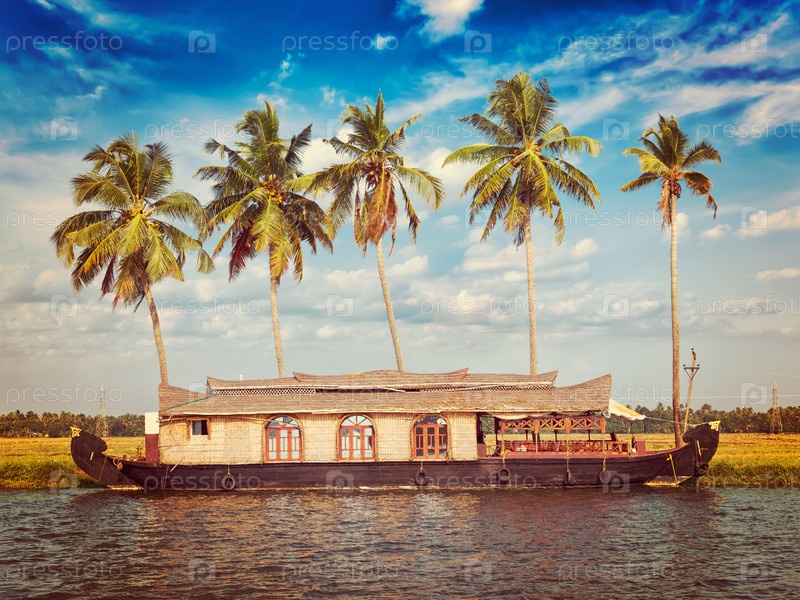 Kerala India tourism travel background это винтажный ретро-эффект фильтруемого изображения хипстерского стиля Houseboat на окраине штата Керала
