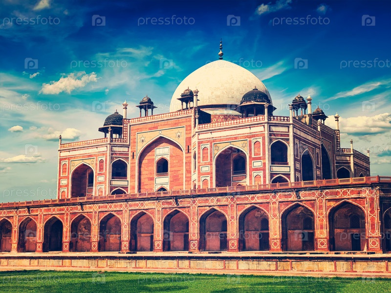 Винтажный ретро-эффект отфильтровал изображение в стиле хипстера известной туристической индийской достопримечательности гробницы Хумаюна.Дели, Индия.Объект Всемирного наследия ЮНЕСКО.Фронтальный вид