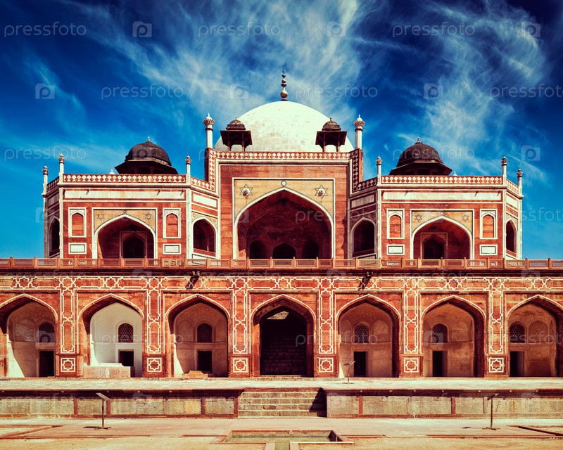 Винтажный ретро-эффект отфильтровал изображение в стиле хипстера известной туристической индийской достопримечательности гробницы Хумаюна.Дели, Индия.Объект Всемирного наследия ЮНЕСКО.Фронтальный вид