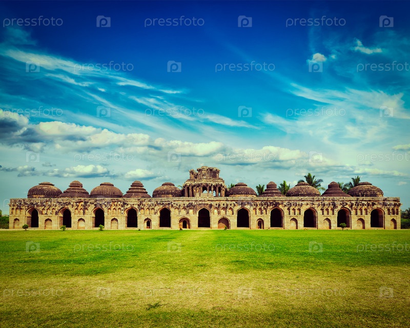 Karnataka Tourism is a vintage retro effect filtered in hipster style изображение древних руин слоновых конюшен, Королевского центра. Хампи, Карнатака, Индия. перекрестно связанные панорамы