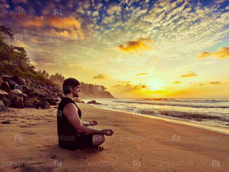 Ретро-эффект в стиле винтажного хипстера изображает спортсмена, практикующего йогу и медитирующего в позе лотоса padmasana на тропическом пляже при закате солнца