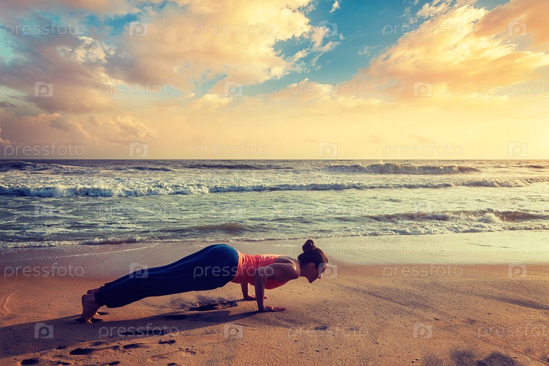 Винтажный ретро хипстер эффект изображения женщины, практикующей Аштанга Виняса йоги - Сурья Намаскар Солнце приветствие асан Chaturanga Dandasana четырех конечностей персонала позируют на закате