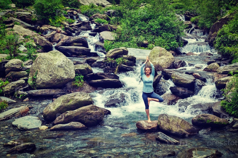 Женщина в асане йоги Vrikshasana позирует у водопада на открытом воздухе