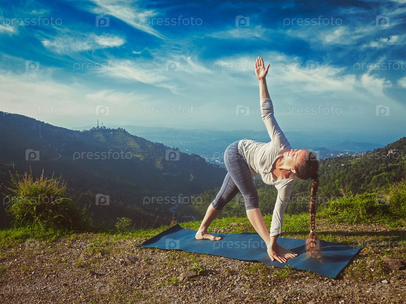 Винтажный ретро-эффект в стиле хипстерского изображения женщины, выполняющей аштангу Vinyasa yoga asana Parivrtta Triconasan - позу треугольника револьвера на открытом воздухе в горах утром