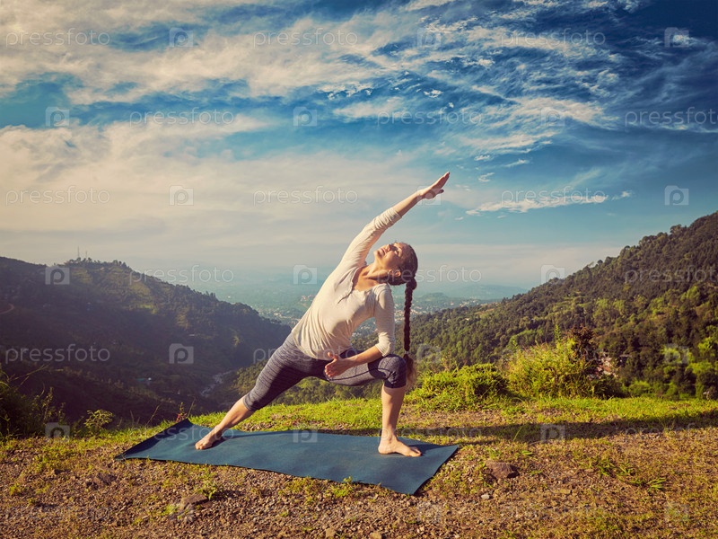 Винтажный ретро-эффект в стиле хипстера изображение спортсменки, практикующей асану йоги Utthita Parsvakonasana - расширенные боковые углы позируют на улице в горах утром