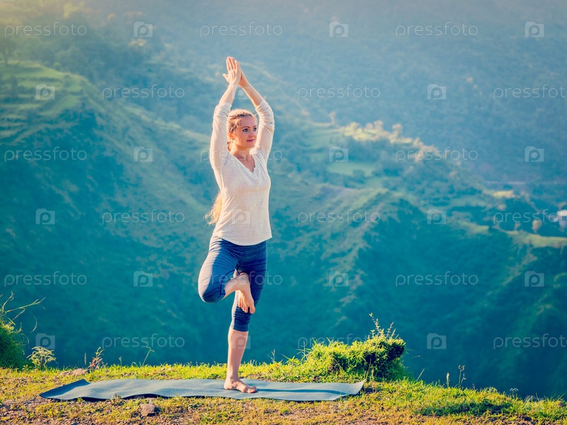 Женщина, практикующая асану йоги Дерево Врикшасана позирует в горах под открытым небом