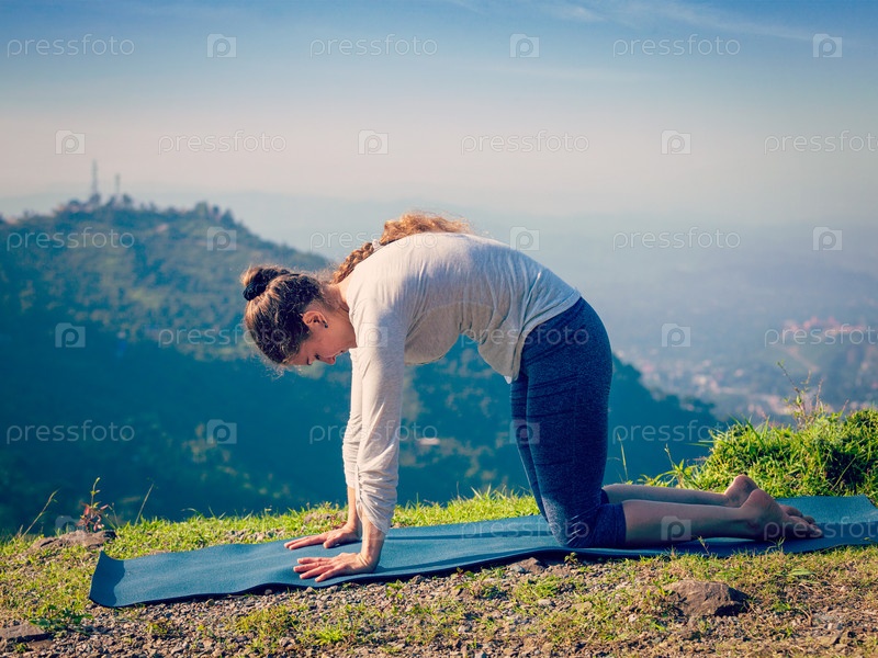 Спортивная женщина практикует йогу асана Марджариасан на открытом воздухе