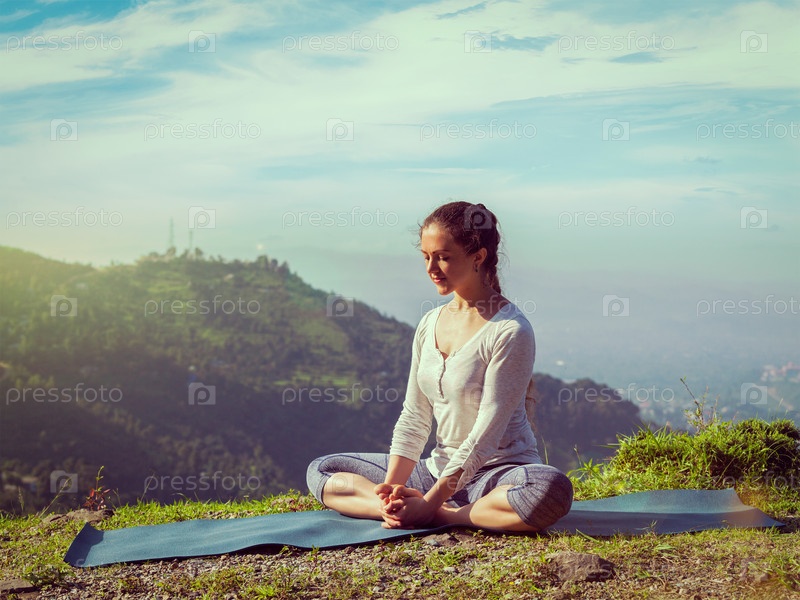 Спортивная женщина практикует Бадда Конасана йога асан на открытом воздухе