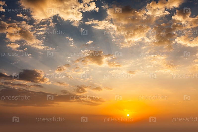 Вечернее закатное небо с солнцем и драматическими облаками