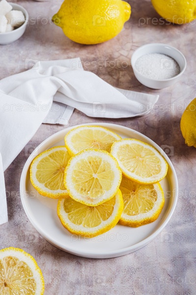 Лимоны нарезают в сочные ломтики на тарелке и целыми на столе вертикальный вид