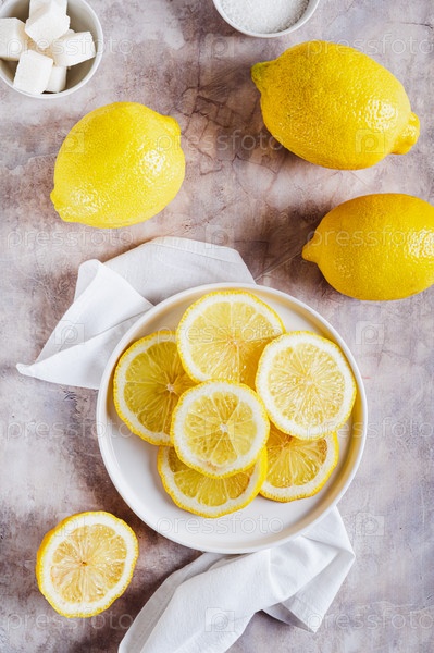 Лимоны нарезают в сочные ломтики на тарелке и целыми на столешнице с вертикальным видом