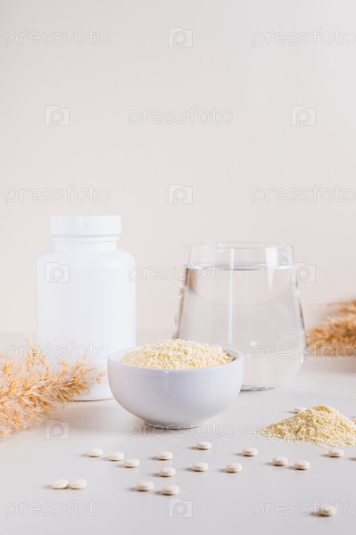 Пептидный порошок в миске и стакан воды на столе вертикальный вид