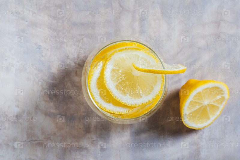 Закрытие освежающей лимонной воды в стакане, как видно сверху стола