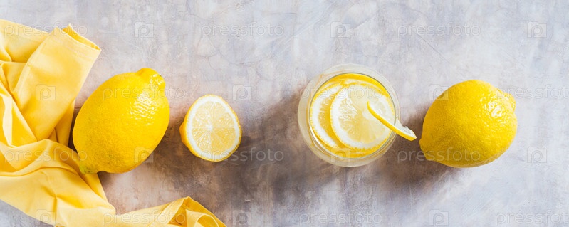Стакан воды с лимонными клинками и лимоном на веб-баннере, выходящем за стол