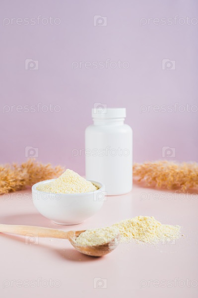 Порошок коллагена в миске, ложке и стакане воды на столе вертикальный вид