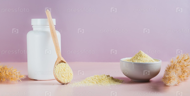 Порошок коллагена в миске и ложке, а также стакан воды на веб-баннере стола