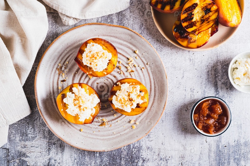 Жареные персиковые половинки с рикоттой и орехами на тарелке с видом на верхнюю часть стола