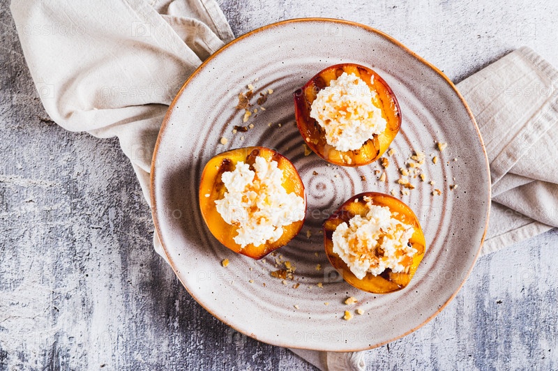 Жарьте половину персика с рикотой и орехами на тарелке в поле зрения сверху стола
