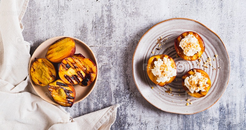 Нагретые персики с творогом, орехами и медом на тарелке с баннером для веб-страниц